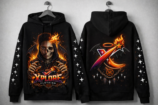 The Fallen Halo hoodie represents duality — angel and demon, life and death, fire and bone. Featuring a high-detail front graphic with a split skull design engulfed in flames, and a celestial-demonic emblem on the back, this piece is built for those who walk their own path.